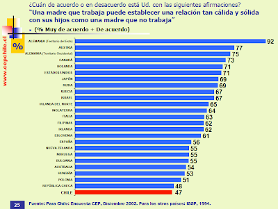 “Seven out of every ten Chileans (69%) believe that “Having a job is fine, but what most women really want is a house and children,” according to a July 2003 study by the Santiago-based Centro de Estudios Públicos.” In my usual P.I. way, I decided to go straight to the source and actually review this study conducted by the CEP, Centro de Estudios Públicos or in English, Center of Public Studies. The CEP is basically a type of think tank and they perform various kinds of studies on behavior, society and culture in Chile. It has several publications and the one I consulted was Estudios Públicos, (Public Studies) which is a quarterly journal containing essays, studies and commentaries by academics and specialists in various fields of study.
