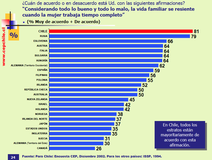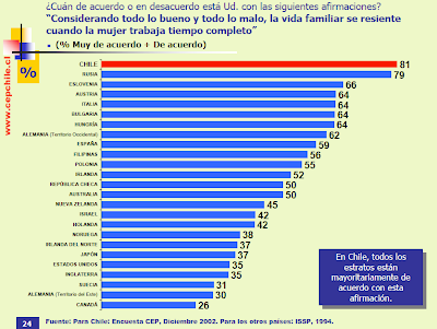 “Seven out of every ten Chileans (69%) believe that “Having a job is fine, but what most women really want is a house and children,” according to a July 2003 study by the Santiago-based Centro de Estudios Públicos.” In my usual P.I. way, I decided to go straight to the source and actually review this study conducted by the CEP, Centro de Estudios Públicos or in English, Center of Public Studies. The CEP is basically a type of think tank and they perform various kinds of studies on behavior, society and culture in Chile. It has several publications and the one I consulted was Estudios Públicos, (Public Studies) which is a quarterly journal containing essays, studies and commentaries by academics and specialists in various fields of study.